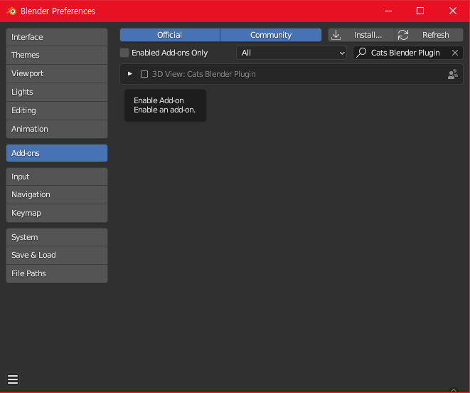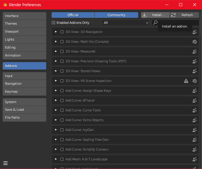 설정을 하신 후 왼쪽 상단의 Edit -> Preferences -> Add-ons 순으로 들어갑니다. Add-ons 메뉴의 오른쪽 상단의 Install an add-on으로 애드온을 설치할 건데, 위에서 다운받으신 애드온의 .zip을 압축해제 하지않고 설치할 겁니다.