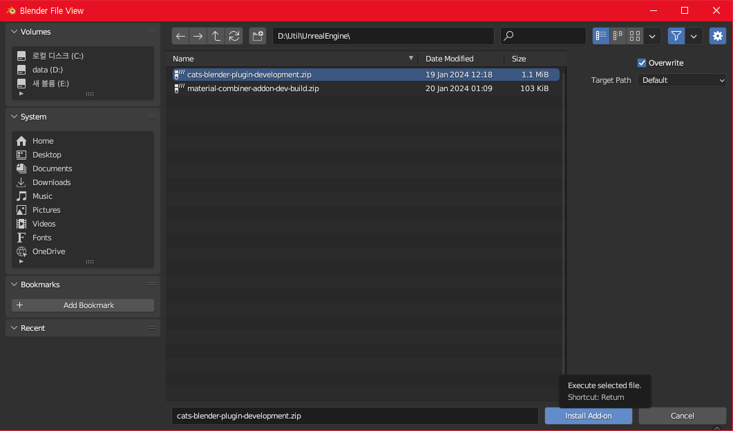 .zip 형태의 애드온들을 선택하여 설치해줍니다. 설치를 하시게 되면 위와 같이 체크박스를 체크해서 애드온을 활성화 합니다.