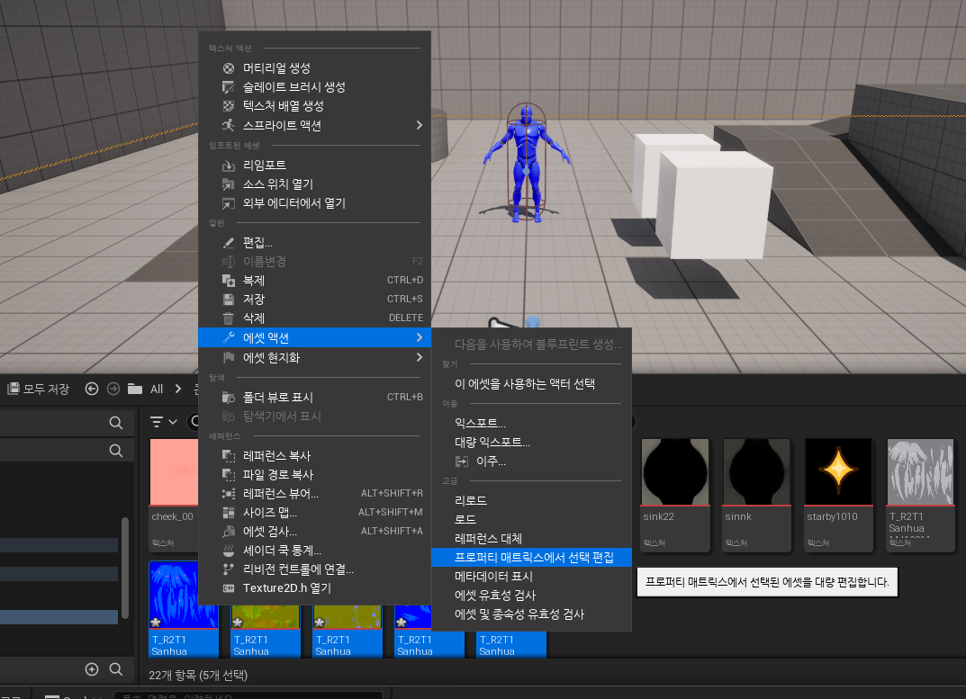 임포트한 텍스쳐 중 노멀 텍스쳐들을 선택하고 마우스의 오른쪽 버튼을 클릭한 후 에셋액션 -> 프로퍼티 매트릭스에서 선택 편집을 클릭해줍니다.
