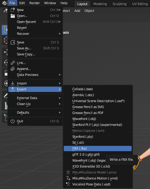 Blender의 오른쪽 상단의 메뉴창에서 File -> Export -> FBX 순으로 클릭합니다.