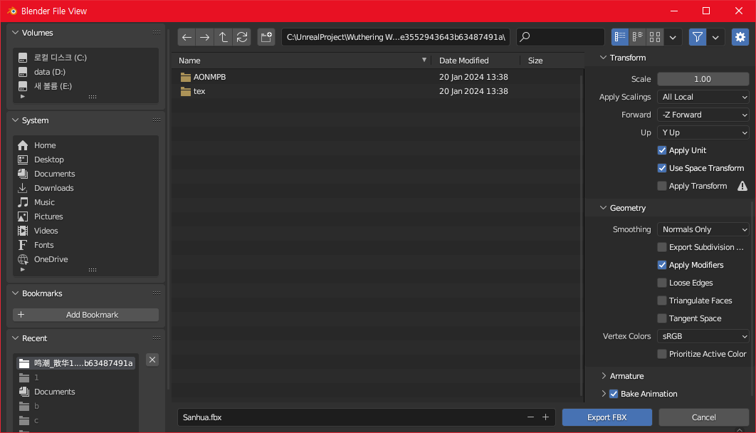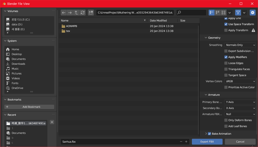 Armature의 Add Leat Bones가 체크되어 있을텐데, 해제 해줍니다. 그리고 Export FBX를 클릭해서 .fbx 파일을 저장합니다.