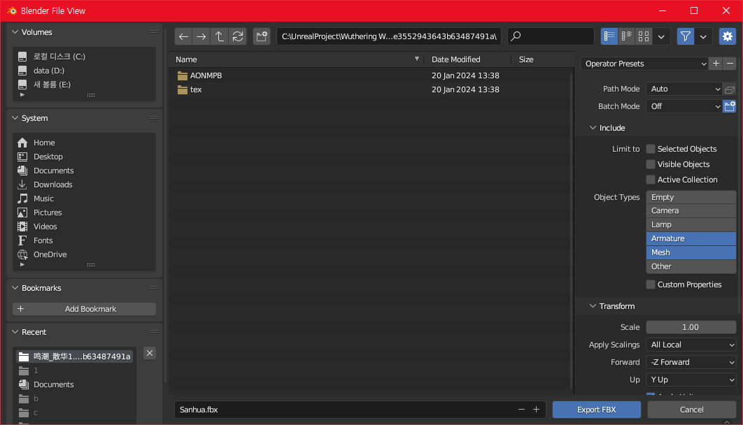 Include의 Object Types에서 Armature와 Mesh를 선택합니다. 클릭을 하나면 하나씩만 선택되는데 키보드의 'Shift' 키를 누른 상태에서 클릭하면 클릭하는 옵션이 모두 선택 됩니다.