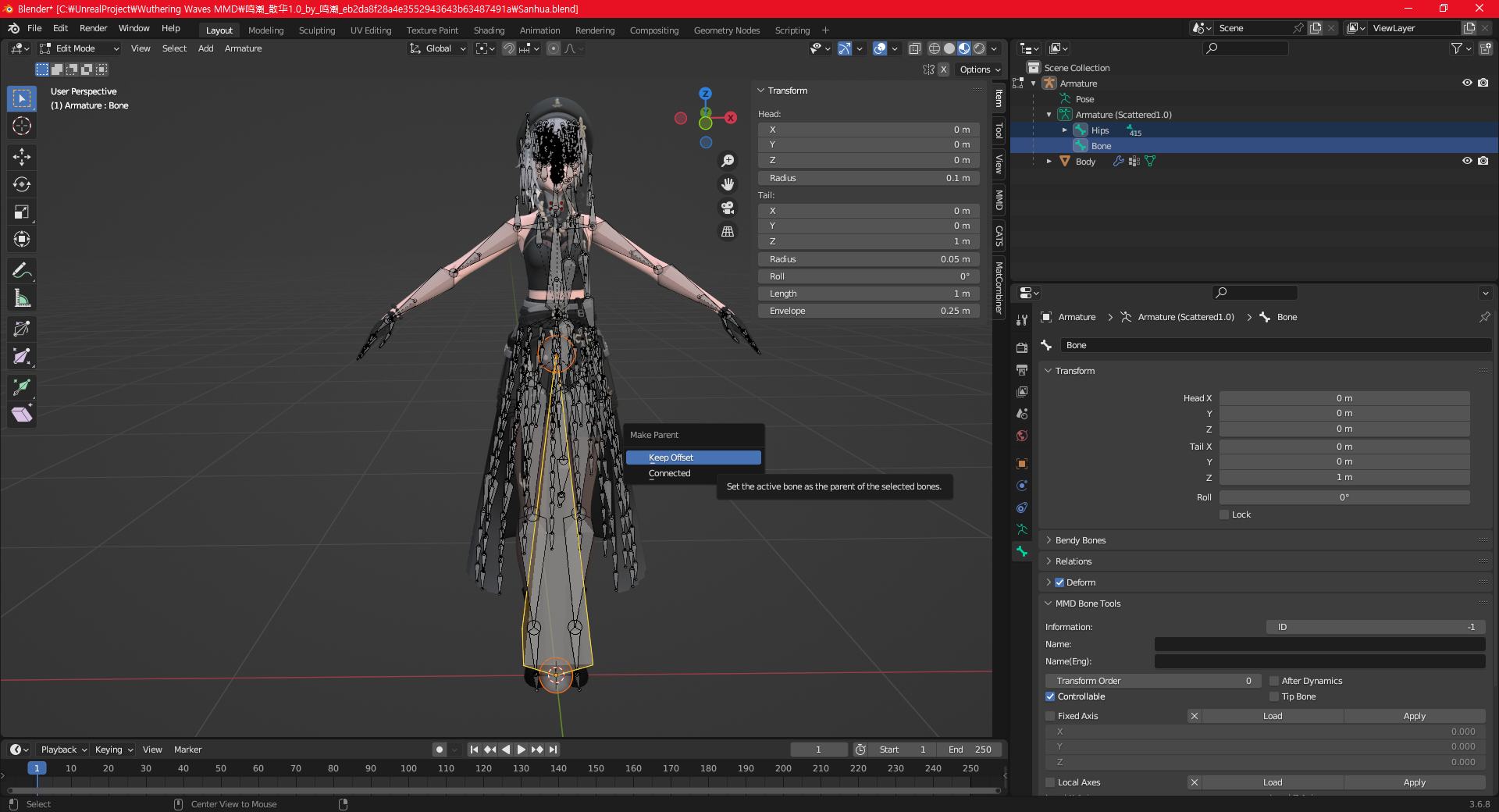 우측의 새로 만든 Bone을 클릭하고 키보드의 'Shift' 키를 누른 상태에서 Hips도 클릭한 다음 마우스를 모델이 있는 화면으로 가져와 키보드의 'Ctrl' 키를 누른 상태에서 'P' 키를 누릅니다.