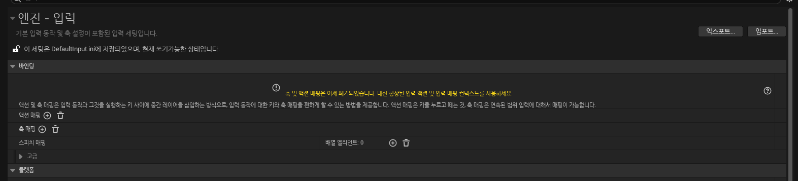 폐기되었다고 축 및 액션 매핑을 사용 수 없다는 것은 아닙니다. 언리얼 엔진 4처럼 사용할 수는 있지만 이후 버전이 올라가면서 버그라던가 업데이트를 지원하지 않는다는 뜻이겠지요. 프로젝트에 따라서 축 및 액션 매핑을 사용하거나, 언리얼 엔진 5에서 사용하는 EnhancedInputSystem을 사용하시면 됩니다.