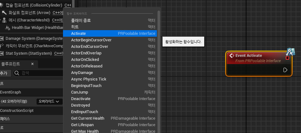 모든 함수는 블루프린트에서 호출 및 오버라이딩을 할 수 있도록 UFUNCTION의 BlueprintCallable, BlueprintNativeEvent를 사용하였습니다.