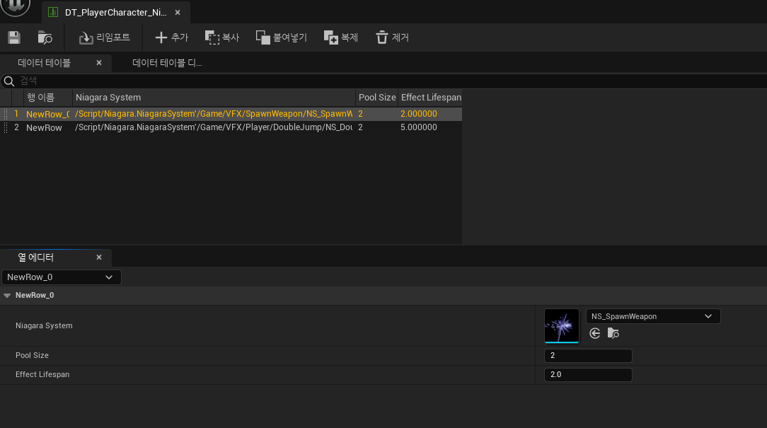 그 후, 주어진 이펙트에 해당하는 설정 값을 DataTable에서 가져와 이를 기반으로 이펙트 액터를 생성하고 초기화합니다. DataTable에 설정 값이 존재하면 해당 값을 사용하고, 존재하지 않으면 기본적으로 DynamicLifespan 값을 사용합니다.