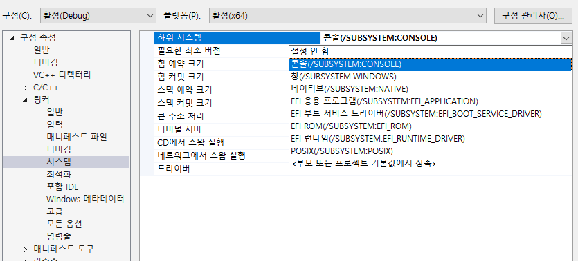 [구성 속성] -> [링커] -> [시스탬]으로 진입하여 하위 시스탬을 '콘솔'이 아닌 '창'으로 변경한다.