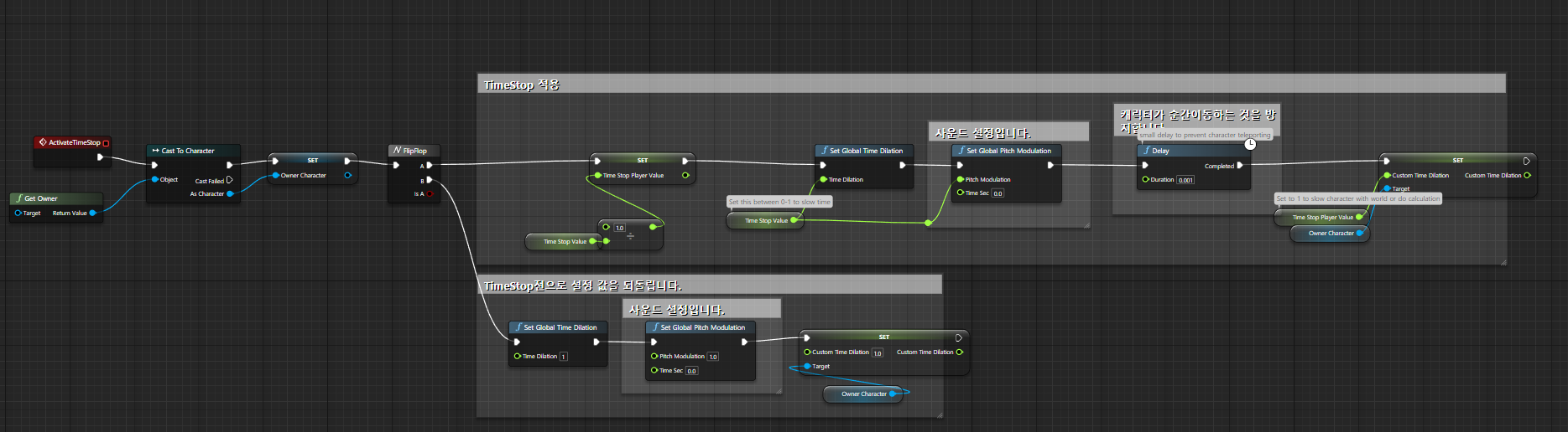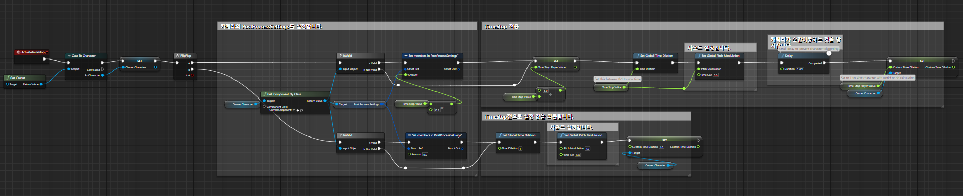 몇몇 액션 게임에선 적을 공격을 알맞은 타이밍에 회피하면 시간이 멈춘 것처럼 캐릭터가 멈추거나 느리게 행동합니다. 이런 기능을 언리얼 엔진으로 만드는 법은 다음과 같습니다. ActorComponent 클래스에서 구현하였습니다.