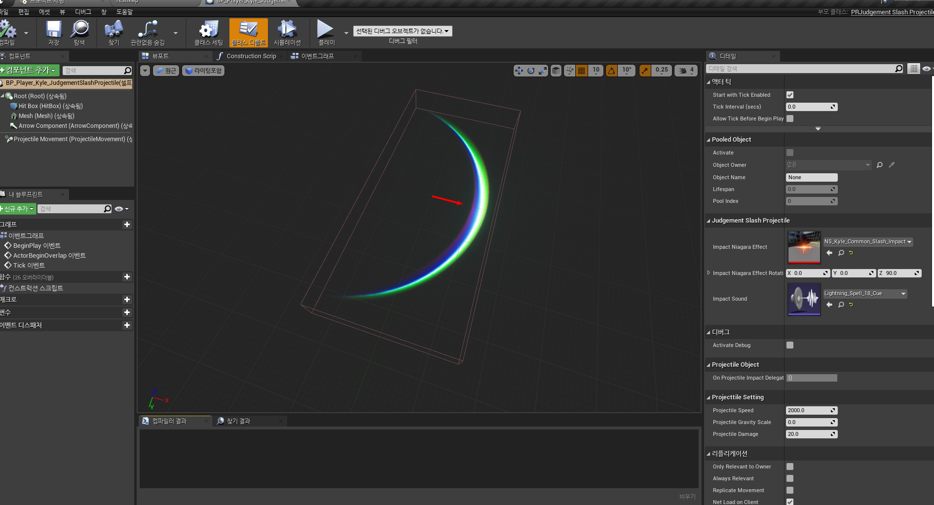 검기 투사체의 Collision이 Overlap을 시작하게 되면 Trace를 실행하고 Trace에 Hit된 Actor들에게 대미지를 주고 Hit된 위치에 HitEffect를 재생합니다.