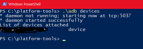 이 때 List of devices attached에 device가 출력되어야 하며 unauthorized가 출력되면 개발자 옵션을 끈후 다시 켜서 USB 디버깅을 다시 시도합니다.