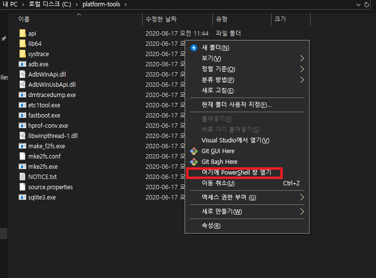 압축을 푼 폴더의 빈공간에 Shift키를 누른 상태에서 마우스 우클릭 후 명령 프롬프트를 실행합니다.