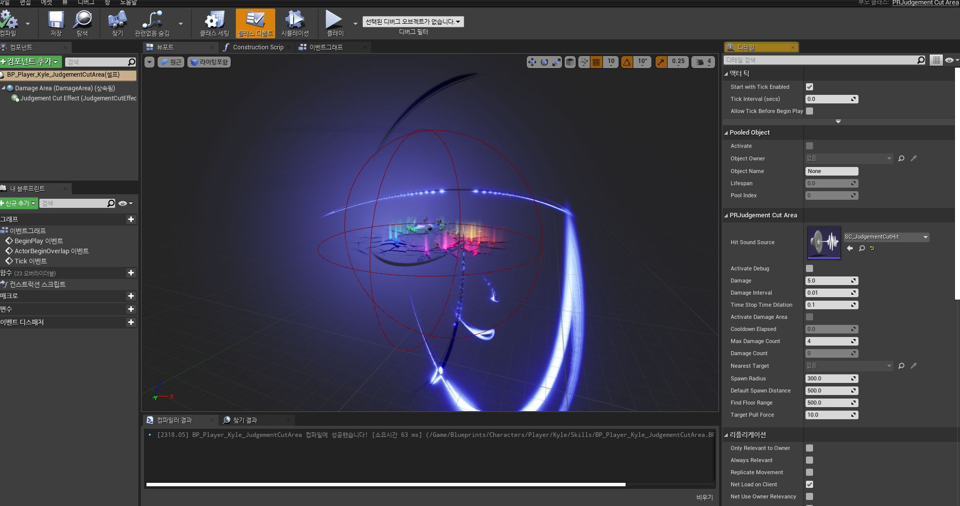 Judgement Cut 스킬을 초기화하는 과정에서 스킬을 사용하는 캐릭터의 ObjectPoolSystem에서 PoolSize의 크기만큼 Area를 비활성화 상태에서 월드에 Spawn하고 Pool에 저장합니다. Judgement Cut 스킬의 상위 클래스인 PRBaseSkill 클래스의 초기화 함수에서 ObjectPool을 생성하고 Judgement Cut 스킬에서 오버라이딩한 초기화 함수에서 Judgement Cut 스킬에서 필요한 초기화 동작을 실행합니다.
