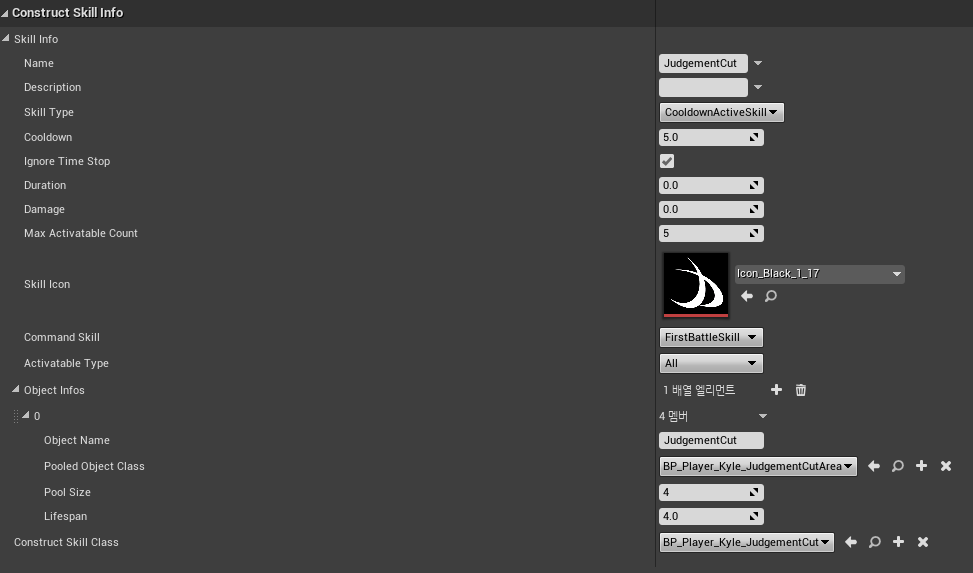 Judgement Cut 스킬의 이펙트 및 범위 피해를 주는 오브젝트(이하 Area)는 캐릭터의 ObjectPoolSystem에서 생성 및 관리하고 있습니다. 게임을 시작하기 전 SkillSystem에서 검기 스킬을 DataTable의 정보를 토대로 스킬을 생성 및 초기화합니다.